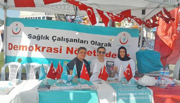 Standın 15 Temmuz Milli Birlik ve Demokrasi günü için, kurum olarak destek vermek adına açıldığını ifade eden Uzm. Dr. Yeşildağ konuşmasına şunları ekledi: "Çanakkale Kamu Hastaneleri Birliği Genel Sekreterliği olarak, Ülkemize, milletimize ve demokrasimize yapılan bu hain kalkışmanın birinci yıl dönümünde, 'Vatan İçin Sağlık Nöbetinde' halkımızla bir arada olmak için organizasyon yaptık. Stant açarak İskele- Demokrasi Meydanında toplanan vatandaşlarımızın göz tansiyonlarını, kan şekerlerini ve tansiyonlarını ölçtük. Bilgilendirme broşürleri dağıttık.Tüm halkımızı standımıza bekliyoruz”
