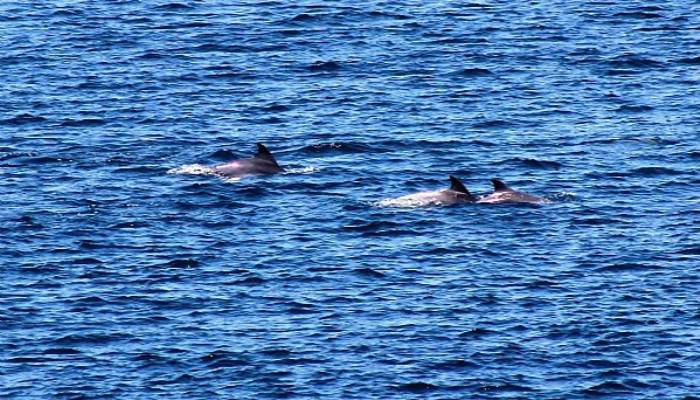 Takıldıkları balık sürüsünün peşinden kıyıya kadar gelen yunus balıkları vatandaşların ilgisini çekti. Vatandaşlar balık tutmayı bırakarak yunusları izliyor.