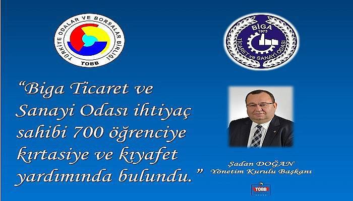 Biga Ticaret ve Sanayi Odası Başkanı aynı zamanda Türkiye Odalar ve Borsalar Birliği (TOBB) Avrupa Birliği(AB) Uyum Komisyonu Üyesi Şadan Doğan,TOBB'nin her yıl dar gelirli ailelere gerek gıda gerekse öğrencilere çeşitli yardımlarda bulunduklarını söyledi. Doğan, 2017-2018 eğitim-öğretim yılının başlaması ile birlikte TOBB, Biga Ticaret ve Sanayi Odamıza ihtiyaç sahibi öğrencilerimize kırtasiye, ayakkabı, kıyafet ve kaban gibi çeşitli yardım malzemeleri dağıtılması için yardım gönderdi. Gönderilen bu yardımlar İlçe Milli Eğitim Müdürümüz Erkan Bilen ile yaptığımız istişareler sonucu ilçe ve köylerdeki okulların idarecileri tarafından belirlenen 700 öğrenciye dağıtıldı. Yardımların yapılmasını sağlayan TOBB Başkanımız Rifat Hisarcıklıoğlu’na, birlikte çalıştığımız Milli Eğitim Müdürlüğümüze teşekkür ediyor, yardımın öğrencilerimizin eğitimine fayda sağlamasını temenni ediyorum. Tüm öğrencilerimize başarılarla dolu bir yıl diliyorum” dedi.