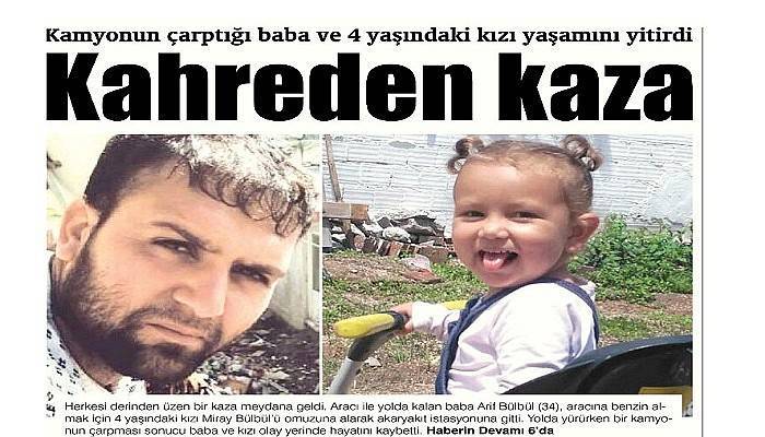 Herkesi derinden üzen bir kaza meydana geldi. Aracı ile yolda kalan baba Arif Bülbül (34), aracına benzin almak için 4 yaşındaki kızı Miray Bülbül’ü omuzuna alarak akaryakıt istasyonuna gitti. Yolda yürürken bir kamyonun çarpması sonucu baba ve kızı olay yerinde hayatını kaybetti.