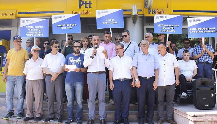 Tarım-Ormancılık ve Bayındır Çevre İnşaat Hizmet Kollarının Yetkili Sendikaları Toç Bir-Sen ve Bayındır Memur-Sen ; Türkiye Büyük Millet Meclisimde kabul edilen sözleşmeli personel ile ilgili yasa teklifindeki adaletsizliği hakkında 81 ilde eş zamanlı olarak basın açıklaması düzenleyerek, AK Parti Grup Başkanı Mehmet Naci Bostancı ve MHP Grup Başkanvekili Erkan Akçay’a konuyla ilgili mektup gönderdi. PTT Çanakkale Baş Müdürlüğü’nde düzenlenen basın açıklamasına Memur-Sen Şube Başkanı Suat Özen, Eğitim Bir Sen Şube Başkanı Resul Can, TOÇ Bir- Sen Şube Başkanı Osman Nuri Tatlı ve çok sayıda vatandaş katıldı. Basın açıklamasını gerçekleştiren TOÇ Bir- Sen Çanakkale Şube Başkanı Osman Nuri Tatlı, “hakkımız olanı istiyor, kadro mücadelemize destek bekliyoruz” şeklinde konuştu.