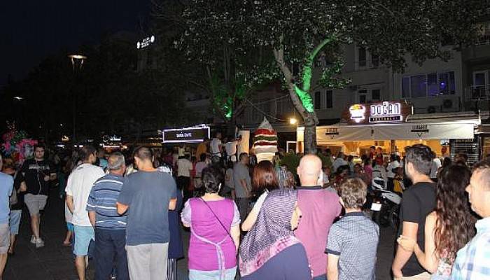 Kemalpaşa Mahallesi kordon boyunda 2 ay önce, bir pastanenin şubesi açıldı. Dondurmasıyla Çanakkale'de meşhur olan pastanenin işletmecileri, dün akşam, açılışa özel toplamda yaklaşık 500 kiloluk Maraş dondurmasını ücretsiz olarak dağıttı. Etkinlik için hazırlanan döner gibi sarılmış olan 200 kiloluk dondurma, 10 kişi tarafından zor taşındı ve askıya asıldı. Ardından 3 kişi, döner dondurmayı satırla keserek, servis etti. Ücretsiz dağıtılan dondurma en çok çocukları sevindirdi. Dakikalar geçtikçe döner dondurma sırası uzayıp gitti. Uzun kuyruk oluştu.![]()