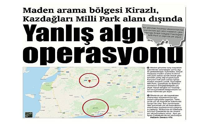 Eylemciler, sosyal medyada maden arama kısmının milli park sahası içinde olarak gösterilerek yanlış algı oluşturuluyor. Kanunen milli park sahası içinde maden araması yasak. Kazdağları Milli Parkı, Çanakkale ile Balıkesir sınırlarının birleştiği bölgede yer alıyor. Kirazlı bölgesi ise Kazdağları’nın Çanakkale bölgesindeki en kenar kısmında yer alıyor.