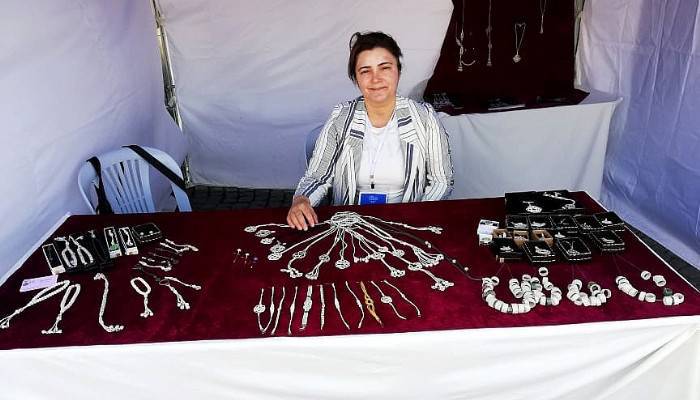 Çeşitli renklerde yaptıklarını ve unutulmaya yüz tutmuş bir sanat olan telkârinin Kültür Bakanlığı desteği ile burada olduğunu ifade eden Telkâri ustası Ayşe Yıldırım, “ Ben 1972 Anakara doğumluyum. İstanbul Üniversitesi Sosyoloji mezunuyum. Gümüş kazaziye ile tanışmam 15 sene oldu. Halk eğitim merkezinde mefruşat eğitimi verirken bir arkadaşımda gördüm ve çok beğendim. Sonra Trabzon’a gidip bunu yerinde öğrendim. 15 senedir bu işi yapıyorum. Tarihini öğrenince aşık oldum. Muhteşem bir şey 5 bin senelik bir sanatmış. En eşli örneği kanatlı denizatı broşuymuş. Kanuni Sultan Süleyman bu işi daha güzel yapıyormuş. Hürrem Sultama yaptığı kolyelerle meşhur olmuş. Şuan da biz süsleme olan kullanıyoruz. Erkeklerde tespih, kol düğmesi olarak kullanıyoruz. 0,8 mikron telin bir iğne üzerinde başka bir iğne üzerinde işlem yaparak örülmesidir. 1 santiminde 300 düğüm var. Çeşitli renklerde yapıyoruz. Unutulmaya yüz tutmuş bir sanat Kültür Bakanlığı desteği ile buradayız. Kültür Bakanlığının bu desteklerini sürdürmek istiyoruz. Liselerde ve üniversitelerde bunun yaygınlaştırılmasını istiyoruz. Hiçbir şekilde bunun eğitimi yok. Çırak usulü ile yetişiyorlar. Üniversitede u yaygınlaşırsa kültürümüz başkalarına miras kalmış olur. Gümüş ayrı bir atmosfer zaten gümüş farklı bir dünyadır. Ben yaparken çok mutlu oluyorum. Kimsenin bilmediği bir şeyi yapmak ayrı bir gururdur. Ankara Altındağ Halk Eğitim Merkezi’nde eğitim veriyorum. Bu işi hanımlara öğretiyorum. Ama ben istiyorum ki gençlere öğreteyim. Evde zaman geçirmek için gelen kadınlar değil bu işi iş yapacak, meslek edinecek, gençler edinmek istiyorum” dedi.