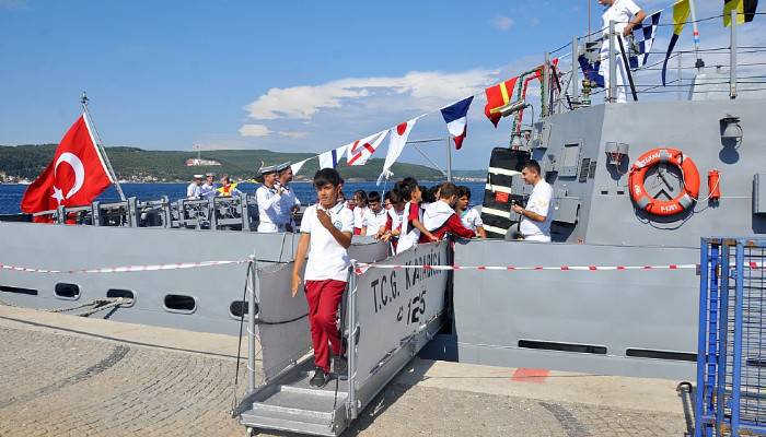 Çanakkale ise Saat 10.00 – 12.00 ve 14.00 – 18.00’da TCG Karabiga gemisi halkın ziyaretine açıldı. Geminin özellikleri ise 15 Haziran 2012 tarihinde hizmete girdi. İstanbul Dearson Tersanesinde yapıldı. Tam boyu 56.9 mt, genişlik 8,9 mt, maksimum suratı 25 kts, direk bazı yüksekliği 57 feet, bağlı bulunduğu liman Nara. Gemide 4 Subay 11 Astsubay, 2 Uzman Erbaş, 16 Erbaş-Er yer alır.