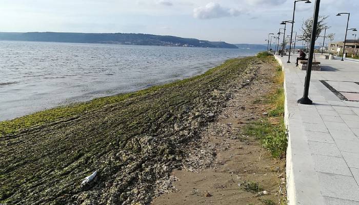 Özellikle mevsim geçişlerinde deniz suyu sıcaklığının yükselmesi ve düşmesi esnasında görülen yosun birikmesi, Çanakkale’de günlerdir hakim olan fırtınanın da etkisiyle Yeni Kordon sahil şeridi yosunla kaplanmasına neden oldu. Yosun kokusu şimdilik bir rahatsızlık vermezken, ilerleyen dönemlerde sıcaklığında etkisiyle çürüyen yosunlar etrafı kötü koku yayıyor. Sabah saatlerinde Yeni Kordon bölgesinde yürüyüş yapan vatandaşlar ise bu durumdan rahatsız olurken, yetkililer tarafından bir an önce önem alınmasını istiyor.