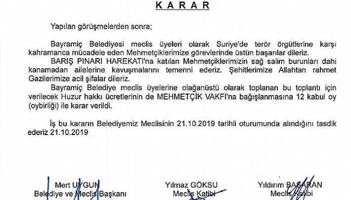 Konuyla ilgili alına kararda; “Bayramiç Belediyesi meclis üyeleri olarak Suriye’de terör örgütlerine karşı kahramanca mücadele eden Mehmetçiklerimize görevinde üstün başarılar dileriz. Barış Pınarı Harekatı’na katılan Mehmetçiklerimizin sağ salim burunları dahi kanamdan ailelerine kavuşmalarını temenni ederiz. Şehitlerimize Allah’tan rahmet Gazilerimize acil şifalar dileriz. Bayramiç Belediye meclis üyelerine olağanüstü olarak toplanan bu toplantı için verilecek huzur hakkı ücretlerinin de Mehmetçik Vakfı’na bağışlanmasına 12 kabul oy ile karar verildi” ifadelerine yer verildi.