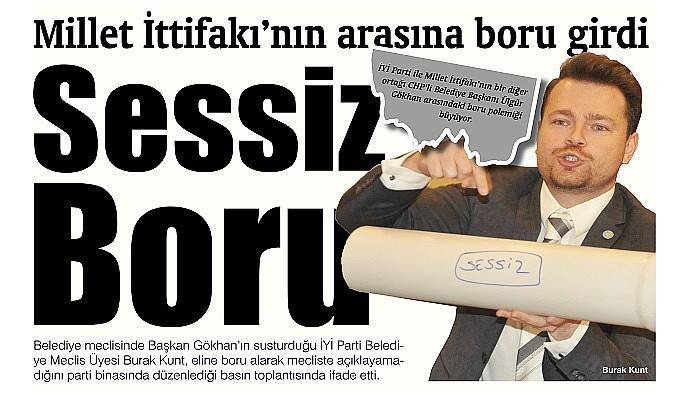 İYİ Parti ile Millet İttifakı’nın bir diğer ortağı CHP’li Belediye Başkanı Ülgür Gökhan arasındaki boru polemiği büyüyor. Belediye meclisinde Başkan Gökhan’ın susturduğu İYİ Parti Belediye Meclis Üyesi Burak Kunt, eline boru alarak mecliste açıklayamadığını parti binasında düzenlediği basın toplantısında ifade etti.