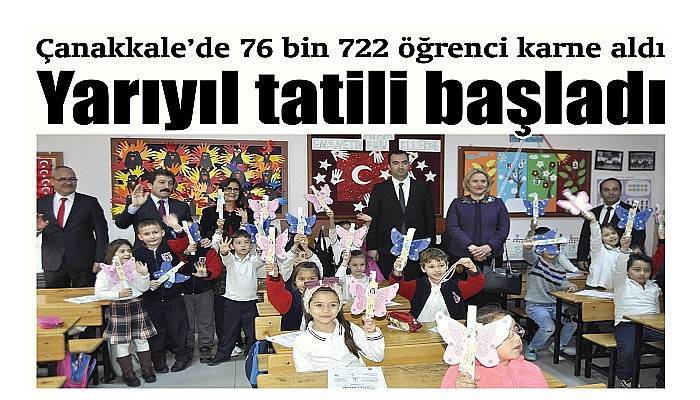 Bu sene öğrencilerin daha verimli eğitim görebilmeleri ve dinlenmeleri açısından Milli Eğitim Bakanlığı ara tatil uygulamasını hayata geçirdi. Buna göre öğrenciler 18-22 Kasım tarihleri arasından ilk ara tatili yaptı. Dün ise Çanakkale’de 2019-2020 eğitim ve öğretim yılının yarıyılında il genelinde toplam 76 bin 722 öğrenci karne sevinci yaşadı. Mustafa Kemal İlkokulunda karne töreni düzenlendi. Törene, Çanakkale Valisi Orhan Tavlı, İl Milli Eğitim Müdürü Ferhat Yılmaz, protokol üyeleri, okul yöneticileri, öğretmenler, öğrenciler ve veliler katıldı. Karne dağıtım töreni, Vali Orhan Tavlı ve beraberindekilerin Mustafa Kemal İlkokulunda öğrencilere karnelerini dağıtmasıyla sona erdi.