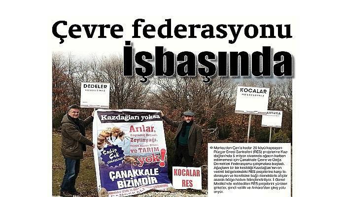 Merkezden Çan’a kadar 20 köyü kapsayan Rüzgar Enerji Santralleri (RES) projelerine Kazdağları’nda 5 milyon civarında ağacın kurban edilmemesi için Çanakkale Çevre ve Doğa Dernekleri Federasyonu çalışmalara başladı. Ağaçların bir bir kesildiği Kazdağları’nın en verimli bölgelerindeki RES projelerine karşı federasyon ve kendisine bağlı derneklerle afişler asarak bölge halkını bilinçlendiriliyor. İl Genel Meclisi’nde reddedilen RES projelerini yürüten şirketler, şimdi valilik ve Ankara’dan çıkış yolu arıyor.