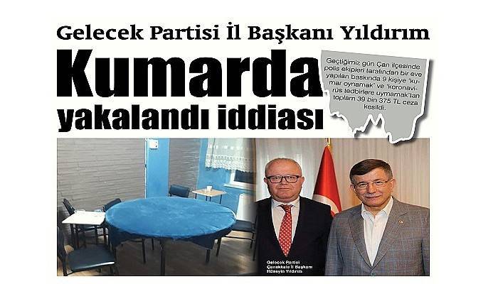 Çan ilçe Emniyet Müdürlüğü ekipleri, 1 Mayıs günü saat 02.30 sıralarında Atatürk Mahallesi İbrahim Bodur Caddesi üzerinde bir evde kumar oynandığı ihbarı üzerine harekete geçti. Ekipler sahur vakti eve operasyon düzenledi. Evde suçüstü yakalanan 9 kişiye 'kumar oynamak' ve 'koronavirüs tedbirlere uymamak'tan toplam 39 bin 375 TL para cezası kesildi. Daha sonra çıkan haberlerde Gelecek Partisi Çanakkale İl Başkanı Hüseyin Yıldırım baskın yapılan evde olduğu iddia edildi. Başkan Yıldırım, konuya ilişkin sosyal medyaya hesabından kamuoyuna açıklama yaparak şu ifadeleri kullandı:“Şahsımla ilgili gerçek dışı ve kamuoyunu yanıltıcı bir haber yayınlanmıştır. Haberde yer alan sokağa çıkma yasağını ihlal ettiğim ve kumar oynadığım iddiası tamamen gerçek dışıdır. Zira iş yerimin bulunduğu ve ikamet ettiğim Çanakkale-Çan ilçesinde Kovid-19 tedbirleri kapsamında sokağa çıkma yasağı hiç ilan edilmemiştir. Dolayısı ile olmayan bir yasağın ihlali de söz konusu değildir. Şahsım uzun yıllardır Çan ilçesinde Serbest Muhasebeci ve Mali Müşavirlik mesleğini icra etmektedir. Hemşehrilerim tarafından sevilen ve sayılan bir konuma sahibim. Bahse konu olay gecesi muhasebesine baktığım bir mükellefim tarafından çay içmek üzere esnaf arkadaşlarından da bulunduğu bir eve davet edildim. Saat 02.30 sularında davet edildiğim yere intikal ettim. Çay içtiğimiz sırada emniyet güçleri kapıya gelerek işlem yapmak istediler. Orada tutulan tutanakta da açıkça ifade ettiğim gibi ne öncesinde ne de olay günü kumar oynamış değilim. Hal böyle iken servis edilen bu yalan ve yanlış haber ile şahsımın karalanmak istemesini şiddetle kınıyorum. Ayrıca bu hususta saklı olan tüm hukuki haklarımı da kullanacağım.”