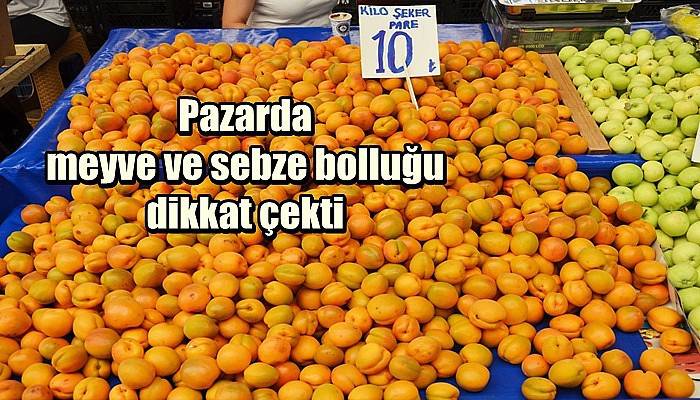 Havaların iyice ısınması ile meyve ve sebze bolluğu yaşanıyor. Meyveler hem görüntüsü hem de fiyatları ile dikkat çekti. Fiyatları ise kayısı kilo 10, elma 7, erik 12, siyah erik kilo 7, armut 10, kavun 3, muz 15 TL olarak satıldı. Sebze fiyatları ile domates 3, kuru soğan 4 kilo 10, dereotu 1, maydanoz 1.5, marul 3, pazı 2.50, deniz börülcesi 3, kabak 2, salatalık 2 TL satıldı.