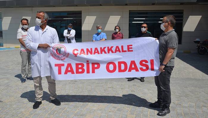 Türk Tabipleri Birliği Çanakkale Tabip Odası Mehmet Akif Ersoy Devlet Hastanesi’nde Covid 19 pandemisinin hekimler ve sağlık çalışanlarının tüm enerjisini ve sabrını tükettiği konusunda basın açıklaması gerçekleştirdi.