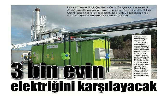 Katı Atık Yönetim Birliği (ÇAKAB) tarafından Entegre Katı Atık Yönetimi (EKAY) projesi kapsamında yapımı tamamlanan ‘Depo Gazından Elektrik Üretim Tesisi’nin açılışı gerçekleştirildi. Tesis, yılda 9 bin megavat enerji üreterek, 3 bin hanenin elektrik ihtiyacını karşılayacak.