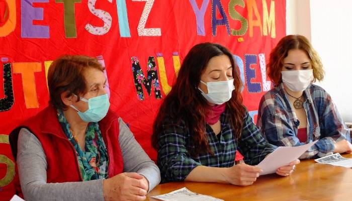 Ceylan, “Ekonomik krizin faturasını halkın sırtına yıkmak isteyen patronlar ve hükümet, pandemiyi fırsata dönüştürdü. Pandemi sürecinde patronların karına hizmet etmek için atılan her adımın sonuçları, kadın emekçiler için daha çok çalışmak, daha çok yoksulluk, giderek artan işsizlik ve açlık oldu. Kısa çalışma, ücretli izne çıkarılma, evden çalışma, işsizlik ve güvencesizlik yaygınlaştı. Kamu da ve özel sektörde salgına karşı bir tedbir olarak başlatılan esnek çalışmanın kalıcı hale getirilmesi için hükümet hızlanmış durumda. Esnek çalışma uygulamalarıyla birlikte ev işi, çocuk bakımı ve iş arasında kadınlar nefessiz kaldı. Bu koşullarda kadınların sadece evde değil, iş yerinde yaşadıkları şiddet de arttı. Mevcut işsizlik, gelir kaybı baskısı, çalışma zorunluluğu kadınların şiddete boyun eğmesi için fırsata dönüştürüldü. İşten çıkarma yasağının istisnası olan ve “ahlak ve iyi niyet kurallarına uymama” anlamına gelen “KOD-29” ile işten çıkartma patronlar tarafından keyfi olarak kullanıldı. Sömürü katmerlenip ekonomik sıkıntılar “uzaya çıkarken”, temel tüketim ihtiyaçları her gün zamlanmakta, geçim sıkıntısıyla yaşanan intiharlar artmakta” dedi.
