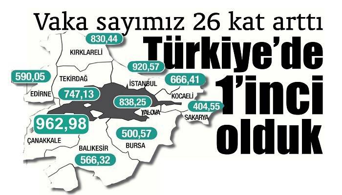Bakan Koca'nın paylaştığı 81 ilin vaka sayılarının açıklandığı haftalık vaka sayısı haritasına göre Çanakkale’de 100 bin kişide 962,98 oldu. En yakın sınır Balıkesir’deki risk salgın başından beri daha fazlayken Çanakkale’deki artış Balıkesir’i geçti. Komşuda vaka sayısı 566,32 olarak kaydedildi. Çevre iller arasında Çanakkale’de vaka oranı haritanın açıklandığı ilk hafta Marmara bölgesinde en az il iken hafta hafta vaka sayısı hızla yükseldi. Çanakkale en az riskli iller arasında yer alırken bu hafta açıklanan son haritada en fazla vaka olan il oldu. Çanakkale’nin 8- 14 Şubat haftasında 37,61 olan vaka sayısı, 10- 16 Nisan haftasında ise 962,98 oldu.