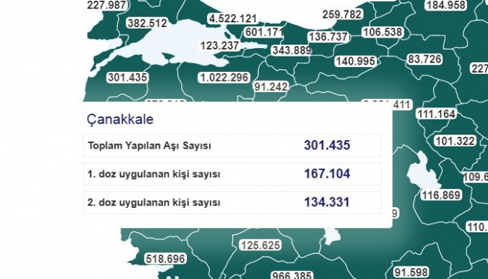 Sağlık Bakanlığı, illere göre yapılan aşı uygulamalarını gösteren "Türkiye Aşı Tablosu"nu açıkladı. Buna göre, Türkiye'de bir doz aşı uygulanan kişi sayısı 15 milyon 695 bin 747’ye çıktı. İki doz aşı uygulanan kişi sayısı ise 11 milyon 746 bin 244'e ulaştı. Toplam uygulanan aşı sayısı 27 milyon 441 bin 991'e yükseldi. Sağlık Bakanlığı tarafından paylaşılan son Aşı haritası verilerine göre Çanakkale’de toplam 301 binden fazla doz aşı yapıldı.