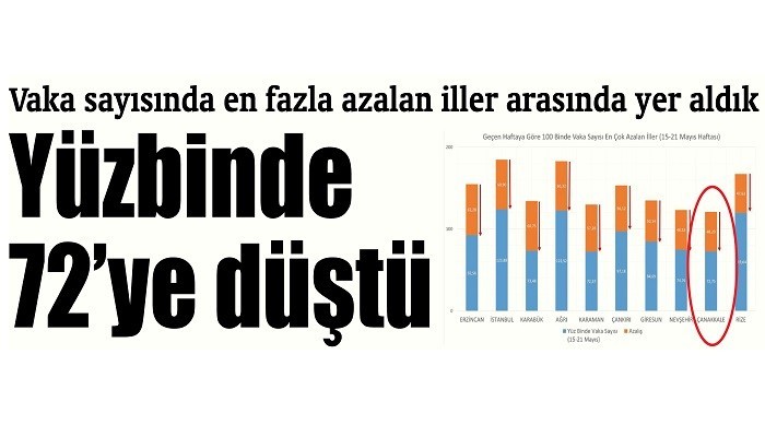 Korona virüsle mücadele kapsamında alınan tedbirlerle kentteki vaka yoğunluğu her hafta azalıyor. Sağlık Bakanı Fahrettin Koca 15-21 Mayıs tarihlerindeki insidans haritasını paylaşarak, ‘’Vaka sayılarının düşüş eğilimi devam ediyor’’ dedi. Vaka sayısı en fazla azalan iller arasında yer alan Çanakkale’de vaka sayısı 72,75’e geriledi.