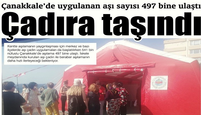 Kentte aşılamanın yaygınlaşması için merkez ve bazı ilçelerde aşı çadırı uygulamaları da başlatılırken 541 bin nüfuslu Çanakkale’de aşılama 497 bine ulaştı. İskele meydanında kurulan aşı çadırı ile beraber aşılamanın daha hızlı ilerleyeceği bekleniyor.