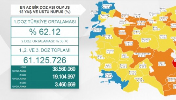 Buna göre, Türkiye'de bir doz aşı uygulanan kişi sayısı 38 milyon 705 bin 258’e çıktı. İki doz aşı uygulanan kişi sayısı ise 19 milyon 696 bin 199’a ulaştı. Toplam uygulanan aşı sayısı 61 milyon 950 bin 758'e yükseldi. Sağlık Bakanlığı tarafından paylaşılan son Aşı haritası verilerine göre Çanakkale’de toplam 604 binden fazla doz aşı yapıldı.