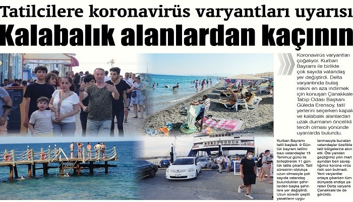 Kurban Bayramı tatili başladı. 9 Günlük bayram tatilini bazı vatandaşlar 15 Temmuz günü ile birleştirerek 11 günlük tatile çıkarttı. Tatil süresinin oldukça uzun olmasıyla çok sayıda vatandaş bulundukları şehirlerden başka şehirlere yer değiştirdi. Uzun süredir çeşitli yasakların uygulanmasıyla bunalan vatandaşlar özellikle tatil bölgelerine akın etti. Öte yandan geçtiğimiz yılın mart ayından beri savaştığımız korona virüs riski son bulmadı. Yeni varyantlar ortaya çıkarken tüm dünyada endişe yaratan Delta varyantı Çanakkale’de de görüldü.  Çanakkale Tabip Odası Başkanı Güleda Erensoy, hem virüs ile ilgili hem de tatilcilerin bu dönemde alması gereken önlemler hakkında önemli açıklamalarda bulundu.