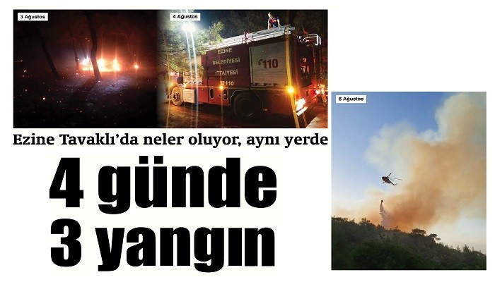 Tavaklı’da 4 Ağustos Çarşamba akşamı yine yangın çıktı. Devam eden yangını paylaşan Ezine Belediye Başkanı Güray Yüksel, "Başaramayacaksınız. And içtik yaktırmayacağız. Gençler az kaldı sabır tüm ekiplerimiz ve araçlarımız ile yoldayız" notunu düşerek paylaştı. Yangın kısa sürede söndürüldü.
