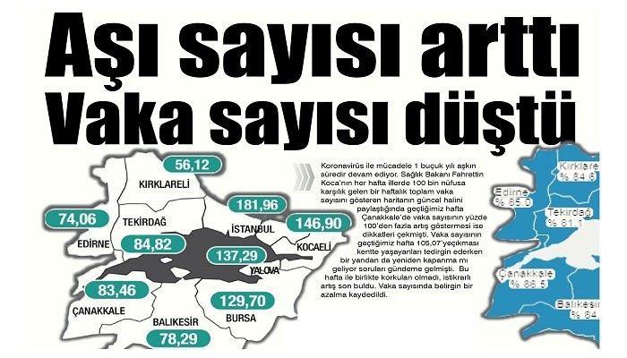 Bakan Koca'nın paylaştığı 81 ilin vaka sayılarının açıklandığı haftalık vaka sayısı haritasına göre Çanakkale’de 100 bin kişide 83,46 olarak kaydedildi. En yakın sınır Balıkesir’de de vaka sayısı düşmeye başladı Komşuda vaka sayısı 88,47’den 78,29’a geriledi. Marmara Bölgesinde en düşük vaka sayısına sahip il Kırklareli olarak kaydedildi. Öte yandan tüm Marmara bölgesinde vaka sayılarında düşüş başladı.