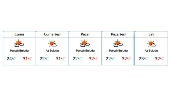 Meteoroloji Genel Müdürlüğü tarafından paylaşılan hava durumu raporuna göre yeni haftaya kadar güneş yerini bulutlu havaya bırakacak. Hava sıcaklıkları ise 32 derece civarında seyredecek.