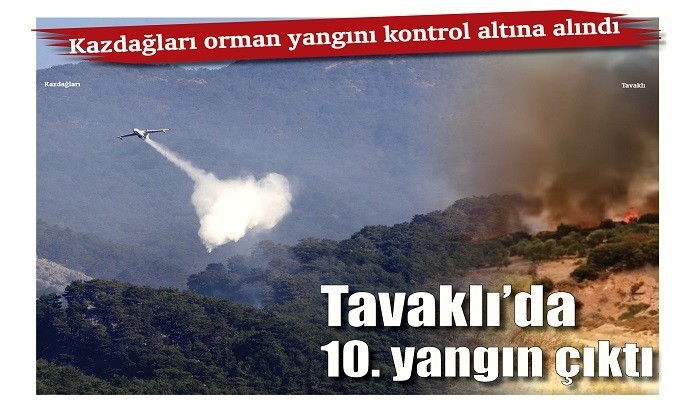 Çanakkale ve Balıkesir sınırları içinde bulunan ve bölgenin oksijen deposu olarak bilinen Kazdağları’nda iki gün süren orman yangını kontrol altına alındı. Balıkesir bölgesinde çıkan ve sınırımıza kadar devam eden yangın kontrol altına alındığını Tarım ve Orman Bakanı Bekir Pakdemirli duyurdu. Kazdağları’ndaki yangının kontrol altına alındı haberine sevinemeden Ezine’ye bağlı Tavaklı bölgesinde yangın haberi geldi. Bu yangın ile beraber bir ay içinde Tavaklı’da çıkan 10’uncu yangın oldu.