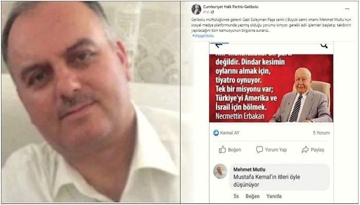 Çanakkale Gelibolu Gazi Süleyman Paşa Cami (Büyük Cami) imamı Mehmet Mutlu’nun sosyal medyada, Necmettin Erbakan’ın sözlerini içeren paylaşımın altına yaptığı “Mustafa Kemal’in itleri öyle düşünüyor” yorumu büyük tepki çekti.