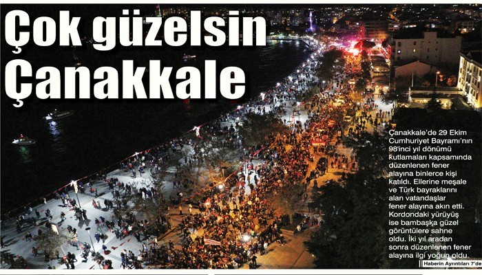 Pandemi nedeniyle iki yıldır fener alayı yapılmıyordu. İki yıl aradan sonra Cumhuriyet'in 98'inci yıldönümü kutlamaları çerçevesinde fener alayı yeniden düzenlendi. Çanakkale Belediyesi tarafından düzenlenen fener alayı saat 19.30'da başladı. Yürüyüşe, Çanakkale Belediye Başkanı Ülgür Gökhan, siyasi parti temsilcileriyle çok sayıda vatandaş katıldı.