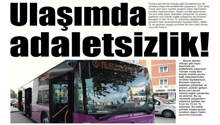 Türkiye genelinde olduğu gibi Çanakkale’de de ücretsiz ulaşımda adaletsizlik yaşanıyor. Çok fazla maaş alan bazı meslek grupları toplu taşımadan ücretsiz faydalanırken, asgari ücretle geçinenler ise tam bilet alıyor. Belediye çalışanları ve aileleri, polislere son olarak sağlık çalışanları da eklendi. Maaşları 5 bin ile 15 bin TL arasında değişenler ücretsiz halk otobüslerinden faydalanırken, 2800 TL ile geçinen asgari ücretliler ise tam bilet almak zorunda kalıyor.
