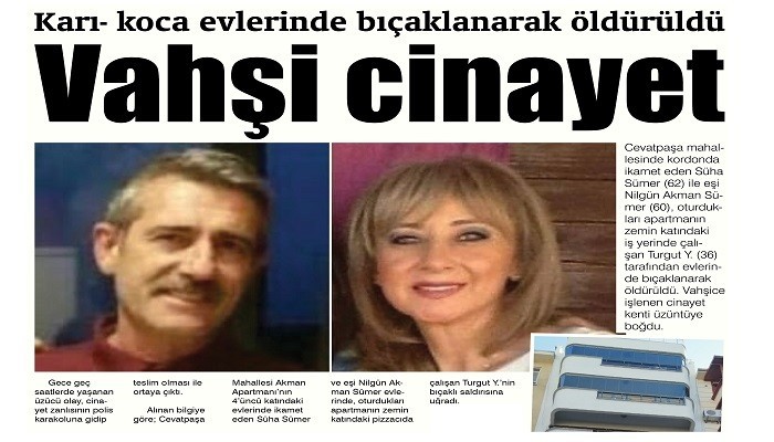 Cevatpaşa mahallesinde kordonda ikamet eden Süha Sümer (62) ile eşi Nilgün Akman Sümer (60), oturdukları apartmanın zemin katındaki iş yerinde çalışan Turgut Y. (36) tarafından evlerinde bıçaklanarak öldürüldü. Vahşice işlenen cinayet kenti üzüntüye boğdu.