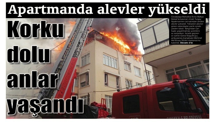 Dün, öğle saatlerinde Cevatpaşa Mahallesi İkinci Bahçe Sokak’ta bulunan 4 katlı Turgay Apartmanı'nın çatı katında yangın çıktı.Yükselen alevler, evi kullanılamaz hale getirirken can kaybının yaşanmaması yüreklere su serpti. Fenalık geçiren ev sahibi Gönül Soğukkuyu,ambulansla Çanakkale Mehmet Akif Ersoy Devlet Hastanesi'ne kaldırıldı.