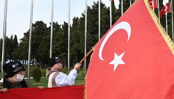7 farklı bölgeden gelen 21 down sendromlu çocuk, Çanakkale Şehitler Abidesi’nde 21 metre Türk bayrağı açarak, sembolik şehit mezarlıklarında dua etti.