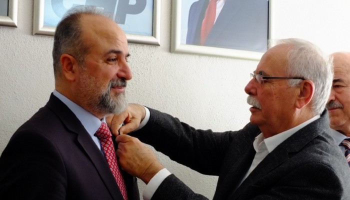 Yeniden Cumhuriyet Halk Partisine dönen İrfan Dehmen’e parti rozetini, Çanakkale Belediye Başkanı Ülgür Gökhan takdim etti.