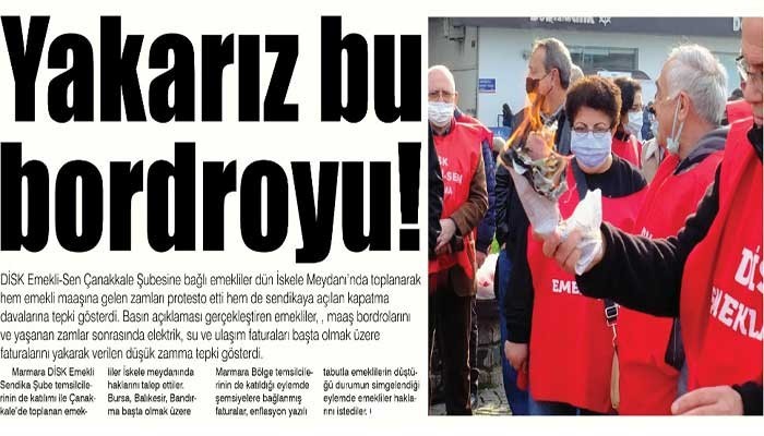 DİSK Emekli-Sen Çanakkale Şubesine bağlı emekliler dün İskele Meydanı’nda toplanarak hem emekli maaşına gelen zamları protesto etti hem de sendikaya açılan kapatma davalarına tepki gösterdi. Basın açıklaması gerçekleştiren emekliler, , maaş bordrolarını ve yaşanan zamlar sonrasında elektrik, su ve ulaşım faturaları başta olmak üzere faturalarını yakarak verilen düşük zamma tepki gösterdi.