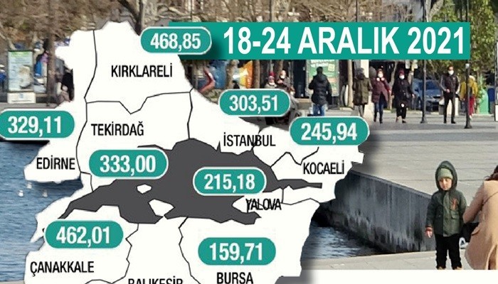 Haritaya göre, İstanbul’da 100 bin kişide görülen vaka sayısı 663,69, Ankara’da 184,29 ve İzmir’de 323,30 oldu. Çanakkale, bu hafta 594 vaka ile Eskişehir ve İstanbul’un ardından üçüncü sıraya yerleşti.