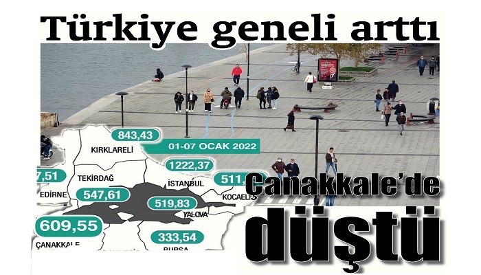 Haftalık verilere göre 100 binde en fazla Kovid-19 vaka sayısı ilk olarak açıklandığı 8-14 Şubat tarihleri arasında Çanakkale 37,61 ile Türkiye genelinde 100 bin nüfusta en çok artış görülen 5 il arasında gösterilmişti. 15-21 Şubat dönemini kapsayan bir haftalık süreçte ise bu rakam 43,76’ya yükseldi. 20-26 Şubat tarihleri arasında da artış devam etti ve bir hafta öncekine göre iki kat artan vaka sayısı Çanakkale için 81,51 olarak açıklandı. 27 Şubat-5 Mart dönemine ait aktarılan verilerde ise yükseliş ivmesi yukarıya doğru devam ederek 107,29’a çıktı. 6-12 Mart 2021 tarihleri arasında da vaka sayılarının katlanarak arttığı görülürken rakam yüz binde 149,76 olarak istatistiğe yansıdı. 13-19 Mart 2021 döneminde rakam 202,75’e yükseldi. 20-26 Mart 2021 tarihleri arasında ise 348,81 olarak açıklanan Çanakkale’de vakalar hızla hiç durmadan artmaya devam ederek 27 Mart 2 Nisan tarihlerini kapsayan aralıkta 546,77 oldu. 3-9 Nisan tarihlerinde ise 797,34’e yükselen bu rakam Çanakkale’yi ülke genelinde üçüncü sıraya yerleştirdi. 10-16 Nisan tarihlerine ait 100 bin nüfusa karşılık gelen haftalık vaka sayısını gösteren insidans haritası Çanakkale’de adeta şok etkisi yarattı. Bir haftalık süreyi kapsayan dönemde797,34 olan vaka sayısı 962,98’e yükselirken, bu istatistikle Türkiye’de nüfusa göre en çok vaka iller arasında Çanakkale birinci sıraya yerleşti. 17-23 Nisan tarihlerini aralığında ise Çanakkale’deki vaka sayıları ilk kez düşüş göstererek 838,89 olarak açıklandı. 24-30 Nisan dönemini kapsayan vaka sayılarında da Çanakkale’deki düşüş devam ederek 439,11’e geriledi. 1-7 Mayıs tarihleri arasında düşüş büyük oranda gerçekleşirken Çanakkale’de 100 bin nüfusa göre vaka sayıları 233,59 olarak açıklandı. 8-14 Mayıs tarihlerini aralığında vaka sayısı 120,95’e geriledi. 15-21 Mayıs tarihlerini aralığında72,75 olarak verilere yansıdı. 22-28 Mayıs tarihlerinde ise bu rakam 60,38’e düştü. Vaka sayılarındaki düşüş 29 Mayıs-4 Haziran haftasında da devam etti. Bu süreçte vaka sayıları 43,67 olarak, 100 bin nüfusa karşılık gelen haftalık vaka sayısını gösteren insidans haritasında yer aldı. 5-11 Haziran tarihlerinde 39,70 düştükten sonra ise 12-18 Haziran döneminde Nisan ayından sonra ilk defa küçük bir artışla 40,07’ye yükseldi. 19-25 Haziran döneminde ise yeniden düşüşe geçerek 26,41’e indi. 100 bin nüfusa karşılık gelen haftalık vaka sayısını gösteren insidans haritasına göre Çanakkale'de vaka sayılarındaki düşüşler 26 Haziran-2 Temmuz aralığında da devam ederek 21,60’a geriledi. 3-9 Temmuz tarihleri -* düşen vaka sayıları delta varyantının da etkisiyle 2Çanakkale’de 10-16 Temmuz döneminde 21,57’e yükseldi. Artış 17-23 Temmuz tarihleri arasında devam etti. Kurban Bayramı sonrasındaki tabloya göre Çanakkale’de vaka sayıları 31,21 olarak açıklanmıştı. Artış, geride bıraktığımız 24-30 Temmuz haftasında devam ederken vaka sayısındaki sıçrama 2 katından daha fazla oldu. 31 Temmuz- 6 Ağustos tarihleri arasında artış devam ederken rakam 105,07 olarak açıklanmıştı. Yaklaşık bir aylık artışın ardından vaka sayıları 7-13 Ağustos tarihleri arasında 83,46’ya geriledi. 14-20 Ağustos döneminde de düşüş devam ederken Çanakkale’deki vaka sayısı 65,37 olarak açıklanmıştı. Kentteki düşüş üst üste dördüncü haftada da devam etti ve 21-27 Ağustos tarihleri arasındaki vaka sayısı 57,43’e geriledi. Ancak beş haftanın sonunda vaka sayıları Çanakkale’de küçük çaplı da olsa bir yükseliş ivmesi göstermiş ve28 Ağustos3 Eylül dönemin 100 bin nüfustaki vaka sayısı 59,83 olarak açıklanmıştı.