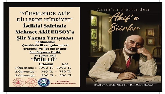 Çanakkale ve ilçelerindeki ortaokul ve lise öğrencileri arasında "Yüreklerde Akif, Dillerde Hürriyet" konulu Millî Şairimiz Mehmet Âkif Ersoy'a şiirlerini yazabilecekleri yarışma düzenlenecek. Son başvuru 28 Şubat olarak açıklanırken yarışma ortaokul ve lise kategorileri olmak üzere 2 grup halinde yapılacak. Her iki grupta da birinciye bin, ikinciye 750 ve üçüncüye 500 TL ödül verilecek.