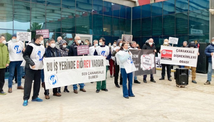Açıklamayı iş bırakma eylemine katılan sağlıkçılar adına okuyan SES Çanakkale Şube Eş Başkanı Canan Coşan; ‘’Sağlığı ticaret, hastaneleri işletme, hastaları müşteri, sağlık çalışanlarını köle olarak gören anlayışın yürürlüğe koyduğu sağlıkta dönüşüm programıyla emeğimiz ucuzlatılmış, koşullarımız kötüleşmiş, halkın sağlık hakkı elinden alınmış, sağlık sistemi işlemez hale gelmiştir. Siyasal iktidar haklarımızı görmezden gelmekte, tercihini sermayeden yana kullanmaktadır. Tüm toplumsal kesimler gibi bizler de geçinemiyoruz. Koruyucu olmaktan çok tedavi edici sağlık hizmeti sunan, sevk zincirinin kalmadığı, kışkırtılmış sağlık talebi yaratan bu sistem, toplumun nitelikli sağlık hizmeti alma hakkını elinden almaktadır. Sağlığa erişim giderek zorlaşmakta, katkı-katılım paylarıyla ekonomik krizin derinleştiği koşullarda yurttaşın cebinden giderek daha fazla para çıkmaktadır. Tükenen bu sağlık sistemi, yetersiz istihdam ve kışkırtılmış sağlık talebiyle bizleri de hızla tüketmektedir.’’ diye ifade etti.