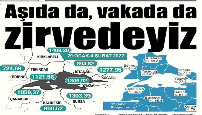 Vaka konusunda da Çanakkale’de şaşırtıcı bir durum yaşanıyor. Aşılamada en üst sıralarda yer alan Çanakkale, vaka haritasında da en fazla vakaya sahip illerde biri 29 Ocak-4 Şubat arasında, 100.000 kişi içinde bir haftalık toplam yeni Covid-19 vaka sayısı il bazında Çanakkale bir önceki haftaya göre büyük artış göstererek bin 59’e yükseldi. Vaka sayısı binin üzerinde çok az il bulunuyor. Hem aşıda hem de vaka sayısında Çanakkale’nin üzün süredir en üst sıralarda yer alması dikkatlerden kaçmıyor. Normal şartlar altında aşılamada en üst sırada yer alan bir ilin vaka sayısında en az olması gerekirken, tam tersi bir durum yaşanıyor Çanakkale’de.
