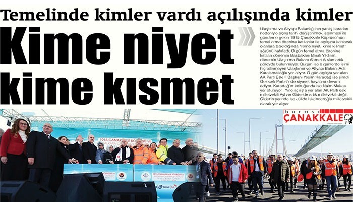 Ulaştırma ve Altyapı Bakanlığı’nın yanlış kararları nedeniyle açılış tarihi değiştirilmek istenmesi ile gündeme gelen 1915 Çanakkale Köprüsü’nün temel atma törenine katılanlar ile açılışına katılacak olanlara bakıldığında “Kime niyet, kime kısmet” sözünü hatırlattı. O gün temel atma törenine katılan dönemin Başbakanı Binali Yıldırım, dönemin Ulaştırma Bakanı Ahmet Arslan artık görevde bulunmuyor. Bugün ise o günlerde isimi hiç bilinmeyen Ulaştırma ve Altyapı Bakanı Adil Karaismailoğlu yer alıyor. O gün açılışta yer alan AK Parti Eski İl Başkanı Yeşim Karadağ ise şimdi Gelecek Partisi’nde siyaset hayatına devam ediyor. Karadağ’ın koltuğunda ise Naim Makas yer oturuyor. Yine açılışta yer alan AK Parti eski milletvekili Ayhan Gider'de artık milletvekili değil. Gider'in yerinde ise Jülide İskenderoğlu milletvekili olarak yer alıyor.