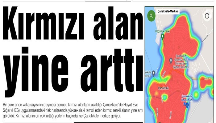 Bir süre önce vaka sayısının düşmesi sonucu kırmızı alanların azaldığı Çanakkale’de Hayat Eve Sığar (HES) uygulamasındaki risk haritasında yüksek riski temsil eden kırmızı renkli alanın yine arttı görüldü. Kırmızı alanın en çok arttığı yerlerin başında ise Çanakkale merkez geliyor.