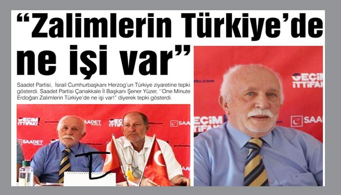 Saadet Partisi, İsrail Cumhurbaşkanı Herzog'un Türkiye ziyaretine tepki gösterdi. Saadet Partisi Çanakkale İl Başkanı Şener Yüzer, ''One Minute Erdoğan Zalimlerin Türkiye'de ne işi var!” diyerek tepki gösterdi.