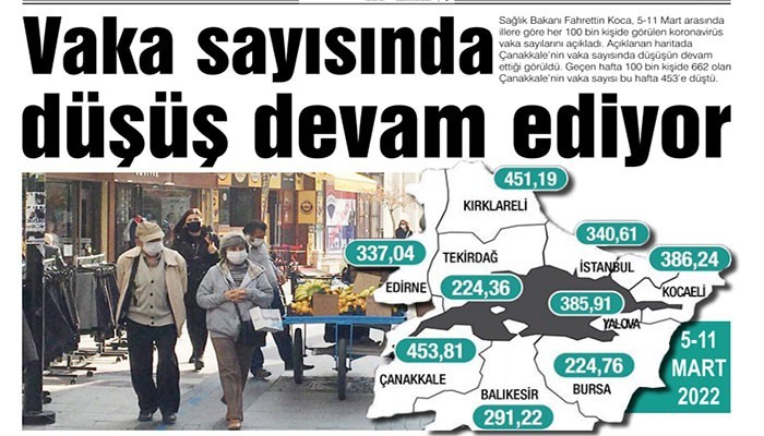 Haftalık verilere göre 100 binde en fazla Kovid-19 vaka sayısı ilk olarak açıklandığı 8-14 Şubat tarihleri arasında Çanakkale 37,61 ile Türkiye genelinde 100 bin nüfusta en çok artış görülen 5 il arasında gösterilmişti. 15-21 Şubat dönemini kapsayan bir haftalık süreçte ise bu rakam 43,76’ya yükseldi. 20-26 Şubat tarihleri arasında da artış devam etti ve bir hafta öncekine göre iki kat artan vaka sayısı Çanakkale için 81,51 olarak açıklandı. 27 Şubat-5 Mart dönemine ait aktarılan verilerde ise yükseliş ivmesi yukarıya doğru devam ederek 107,29’a çıktı. 6-12 Mart 2021 tarihleri arasında da vaka sayılarının katlanarak arttığı görülürken rakam yüz binde 149,76 olarak istatistiğe yansıdı. 13-19 Mart 2021 döneminde rakam 202,75’e yükseldi. 20-26 Mart 2021 tarihleri arasında ise 348,81 olarak açıklanan Çanakkale’de vakalar hızla hiç durmadan artmaya devam ederek 27 Mart 2 Nisan tarihlerini kapsayan aralıkta 546,77 oldu. 3-9 Nisan tarihlerinde ise 797,34’e yükselen bu rakam Çanakkale’yi ülke genelinde üçüncü sıraya yerleştirdi. 10-16 Nisan tarihlerine ait 100 bin nüfusa karşılık gelen haftalık vaka sayısını gösteren insidans haritası Çanakkale’de adeta şok etkisi yarattı. Bir haftalık süreyi kapsayan dönemde797,34 olan vaka sayısı 962,98’e yükselirken, bu istatistikle Türkiye’de nüfusa göre en çok vaka iller arasında Çanakkale birinci sıraya yerleşti. 17-23 Nisan tarihlerini aralığında ise Çanakkale’deki vaka sayıları ilk kez düşüş göstererek 838,89 olarak açıklandı. 24-30 Nisan dönemini kapsayan vaka sayılarında da Çanakkale’deki düşüş devam ederek 439,11’e geriledi. 1-7 Mayıs tarihleri arasında düşüş büyük oranda gerçekleşirken Çanakkale’de 100 bin nüfusa göre vaka sayıları 233,59 olarak açıklandı. 8-14 Mayıs tarihlerini aralığında vaka sayısı 120,95’e geriledi. 15-21 Mayıs tarihlerini aralığında72,75 olarak verilere yansıdı. 22-28 Mayıs tarihlerinde ise bu rakam 60,38’e düştü. Vaka sayılarındaki düşüş 29 Mayıs-4 Haziran haftasında da devam etti. Bu süreçte vaka sayıları 43,67 olarak, 100 bin nüfusa karşılık gelen haftalık vaka sayısını gösteren insidans haritasında yer aldı. 5-11 Haziran tarihlerinde 39,70 düştükten sonra ise 12-18 Haziran döneminde Nisan ayından sonra ilk defa küçük bir artışla 40,07’ye yükseldi. 19-25 Haziran döneminde ise yeniden düşüşe geçerek 26,41’e indi. 100 bin nüfusa karşılık gelen haftalık vaka sayısını gösteren insidans haritasına göre Çanakkale'de vaka sayılarındaki düşüşler 26 Haziran-2 Temmuz aralığında da devam ederek 21,60’a geriledi. 3-9 Temmuz tarihleri -* düşen vaka sayıları delta varyantının da etkisiyle 2Çanakkale’de 10-16 Temmuz döneminde 21,57’e yükseldi. Artış 17-23 Temmuz tarihleri arasında devam etti. Kurban Bayramı sonrasındaki tabloya göre Çanakkale’de vaka sayıları 31,21 olarak açıklanmıştı. Artış, geride bıraktığımız 24-30 Temmuz haftasında devam ederken vaka sayısındaki sıçrama 2 katından daha fazla oldu. 31 Temmuz- 6 Ağustos tarihleri arasında artış devam ederken rakam 105,07 olarak açıklanmıştı. Yaklaşık bir aylık artışın ardından vaka sayıları 7-13 Ağustos tarihleri arasında 83,46’ya geriledi. 14-20 Ağustos döneminde de düşüş devam ederken Çanakkale’deki vaka sayısı 65,37 olarak açıklanmıştı. Kentteki düşüş üst üste dördüncü haftada da devam etti ve 21-27 Ağustos tarihleri arasındaki vaka sayısı 57,43’e geriledi. Ancak beş haftanın sonunda vaka sayıları Çanakkale’de küçük çaplı da olsa bir yükseliş ivmesi göstermiş ve28 Ağustos3 Eylül dönemin 100 bin nüfustaki vaka sayısı 59,83 olarak açıklanmıştı.