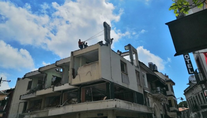 Yıkılan binanın bir kolonunu kaynak makinesiyle kesmeye başlayan işçiler, kolonun aşağıya düşmemesi için ince bir halatla kolonu tutmaya çalıştı.