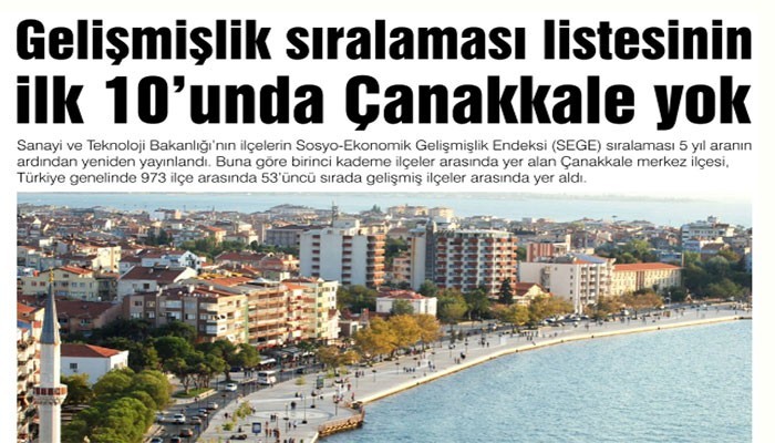 Sanayi ve Teknoloji Bakanlığı’nın ilçelerin Sosyo-Ekonomik Gelişmişlik Endeksi (SEGE) sıralaması 5 yıl aranın ardından yeniden yayınlandı. Buna göre birinci kademe ilçeler arasında yer alan Çanakkale merkez ilçesi, Türkiye genelinde 973 ilçe arasında 53’üncü sırada gelişmiş ilçeler arasında yer aldı.