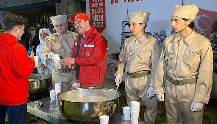 Sahur vaktinde yürüyüşten önce katılımcılara, tümü şehit düşen 57'nci Alay askerlerinin son yemeği olan kırık buğday çorbası dağıtan Gençlik ve Spor Bakanı Dr. Mehmet Muharrem Kasapoğlu, “Çanakkale Ruhunu, 57'nci Alay'ın o fedakârlığını diri tutmak, önemli misyonlarımızdan bir tanesi" dedi.