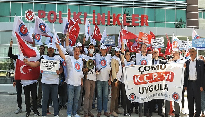 Çanakkale Onsekiz Mart Üniversitesi Sağlık Uygulamaları ve Araştırma hastanesinde çalışan Türk İş Sendikasına bağlı Türkiye Sağlık İşçileri Sendikası üyeleri poliklinikler önünde basın açıklaması yaptı.